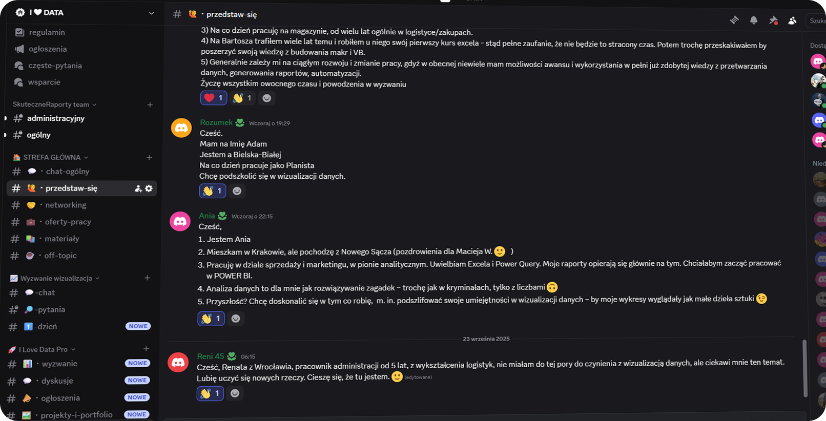 Świetnie, że zapisałaś/eś się na 5-dniowe wyzwanie z Wizualizacji Danych! 🚀 Chcę Cię zaprosić jeszcze do naszej zamkniętej grupy na Discordzie, gdzie już zbierają się inni uczestnicy. Twoja obecność nie jest obowiązkowa - możesz przejść całe wyzwanie samodzielnie z materiałami. Ale… jeśli nie dołączysz, tracisz naprawdę sporo: 🤝 społeczność – poznasz osoby, które są w podobnym miejscu kariery jak Ty, 💡 wymiana wiedzy – zobaczysz, jak inni rozwiązują te same zadania, 📈 motywacja – razem łatwiej wytrwać do końca i ukończyć wszystkie 5 dni, 🎯 feedback – dostaniesz komentarze i wskazówki, które pomogą Ci szybciej się rozwijać. Krótko mówiąc: wyzwanie + społeczność = 2x większe efekty. |