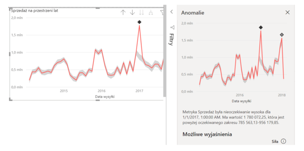 Anomalia oznacza punkty w danych, które odstają od ogólnie przyjętego schematu i wzorca względem innych elementów w zestawie danych. Wychwycenie punktów odstających (z ang. outliers) pozwala nam wychwycić wyjątki i znaleźć ich przyczyny źródłowe. W Power BI mamy do tego wbudowany mechanizm na karcie Analiza dla wykresu liniowego. |