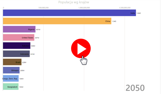 W świecie wizualizacji danych i Power BI co chwilę pojawia się jakiś nowy wykres robiący furorę. Ostatnio był to wykres o nazwie Animated Bar Chart Race, który bardzo atrakcyjnie pokazuje zmiany w czasie. Przyjrzymy się na nim światowej populacji.
