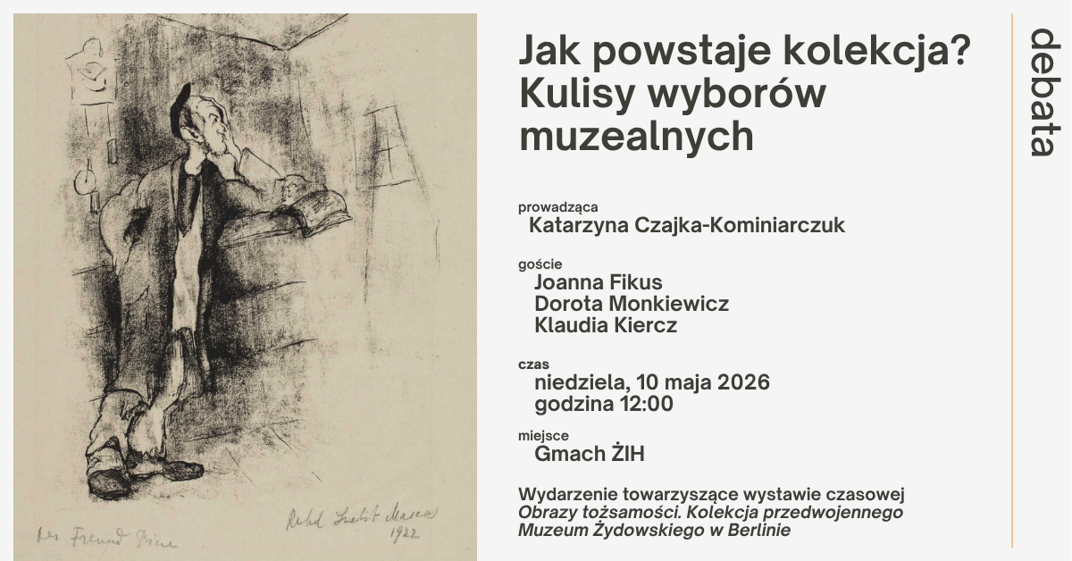 Debata Jak powstaje kolekcja? Kulisy wyborów muzealnych niedziela, 10 maja, godz. 12:00 prowadzenie: Katarzyna Czajka-Kominiarczuk gościnie: Joanna Fikus, Dorota Monkiewicz, Klaudia Kiercz Zachęcamy do udziału w spotkaniu, w trakcie którego porozmawiamy o tym, jak buduje się kolekcję muzealną – od kryteriów wyboru, przez zakup, aż po decyzję o tym, co zostaje zaprezentowane publiczności. Zastanowimy się także, czy o wartości dzieła decyduje jego estetyka, historia, unikalność, a może znaczenie społeczne. Przyjrzymy się też współczesnym projektom artystycznym inspirowanym żydowską historią. Po spotkaniu zapraszamy uczestników na bezpłatne odwiedzenie wystawy „Obrazy tożsamości. Kolekcja przedwojennego Muzeum Żydowskiego w Berlinie”. |