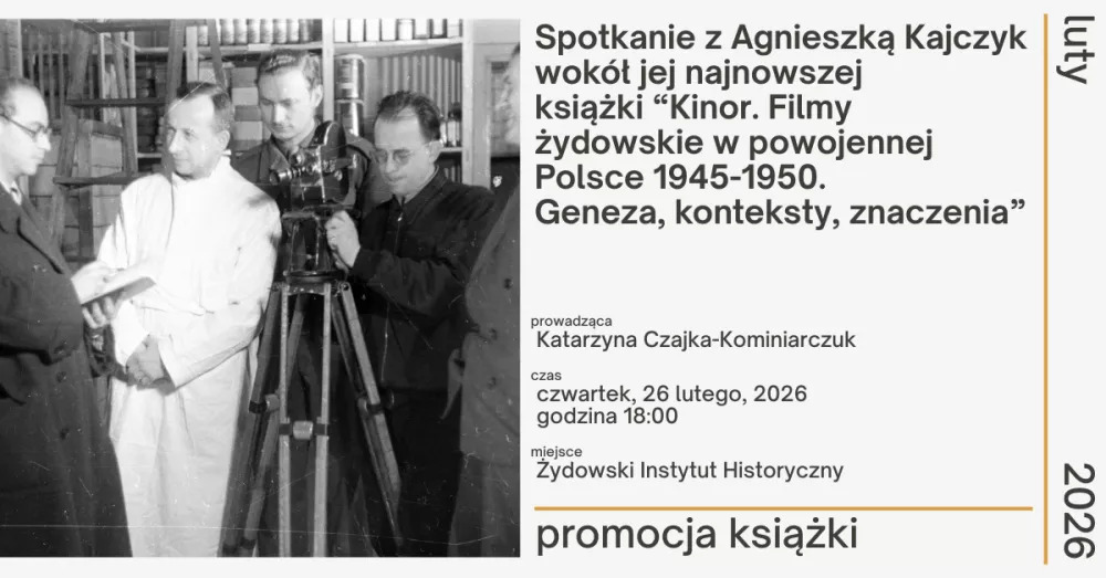 Zapraszamy w czwartek 26 lutego, o godzinie 18.00 na spotkanie poświęcone książce Agnieszki Kajczyk. Autorka odsłoni niemal zapomniany rozdział historii polskiej kinematografii: działalność studia Kinor i próbę odbudowy żydowskiej kultury filmowej w realiach komunistycznej Polski.