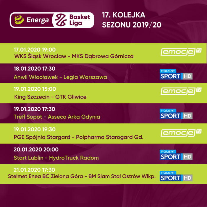Przedłużony weekend z Energa Basket Ligą! Tym razem na kolejne spotkania zapraszamy od piątku do wtorku! Aż cztery mecze pokaże Polsat Sport: Anwil - Legia, Trefl - Asseco Arka, Start - HydroTruck oraz Stelmet Enea - BM Slam Stal. Na pozostałe starcia zapraszamy do serwisu Emocje.TV