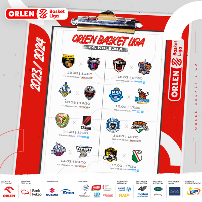 Wyjątkowo w środę rusza 24. kolejka ORLEN Basket Ligi! W sportowych stacjach Polsatu zobaczymy mecze WKS Śląsk - Icon Sea Czarni, PGE Spójnia - Tauron GTK, MKS - Arged BM Stal oraz Muszynianka Domelo Sokół - Legia. Pozostałe spotkania będą dostępne w serwisie Emocje.TV