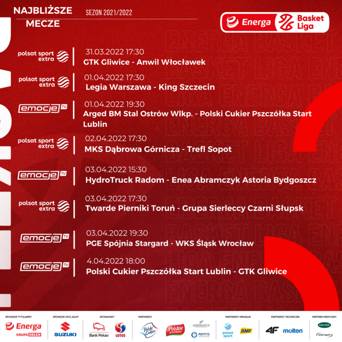 Od czwartku do niedzieli zobaczymy kolejne spotkania 28. kolejki Energa Basket Ligi! Cztery z nich, w tym starcia Legia - King i Twarde Pierniki - Grupa Sierleccy Czarni, transmitowane będą w sportowych stacjach Polsatu. Pozostałe mecze można śledzić w serwisie Emocje.TV