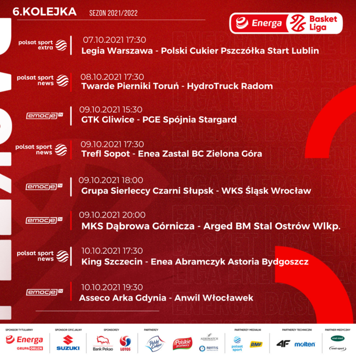 Jak co tydzień zapraszamy na cztery transmisje meczów Energa Basket Ligi do sportowych stacji Polsatu - tym razem będą to starcia: Legia - Polski Cukier Pszczółka Start, Twarde Pierniki - HydroTruck, Trefl - Enea Zastal BC oraz King - Enea Abramczyk Astoria. Pozostałe spotkania można zobaczyć w serwisie Emocje.TV