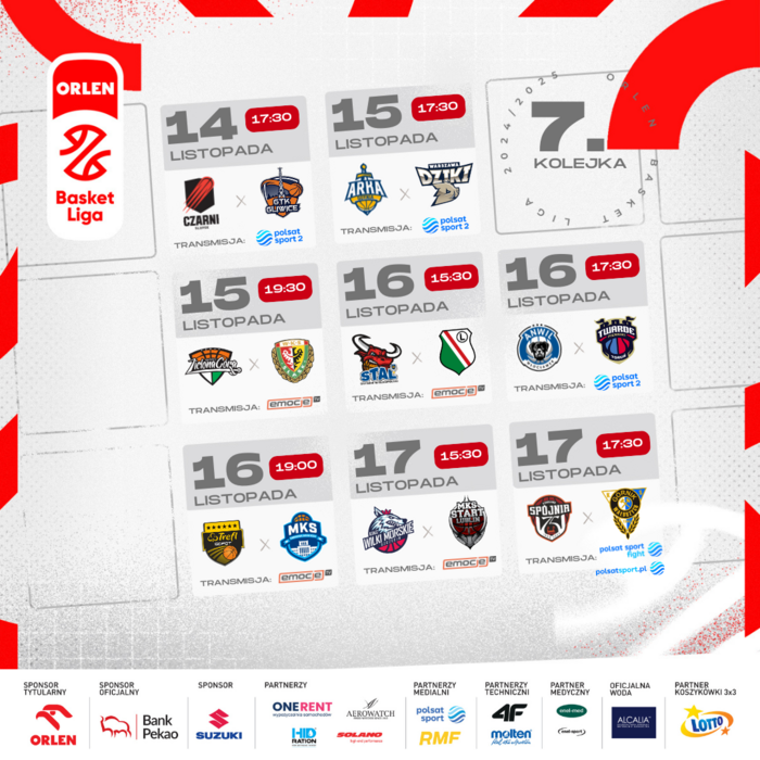 Siódma kolejka ORLEN Basket Ligi potrwa od czwartku do niedzieli! W sportowych stacjach Polsatu zobaczymy spotkania Energa Icon Sea Czarni - Tauron GTK, AMW Arka - Dziki, Anwil - Arriva Polski Cukier oraz PGE Spójnia - Górnik Zamek Książ. Pozostałe mecze dostępne będą w serwisie Emocje.TV