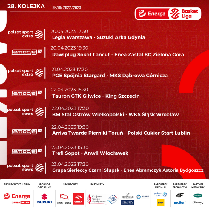 W Energa Basket Lidze teraz każde spotkanie ma ogromne znaczenie! Od czwartku do niedzieli w sportowych stacjach Polsatu zobaczymy mecze: Legia - Suzuki Arka, PGE Spójnia - MKS, BM Stal - WKS Śląsk oraz Grupa Sierleccy Czarni - Enea Abramczyk Astoria. Pozostałe starcia dostępne będą w serwisie Emocje.TV |