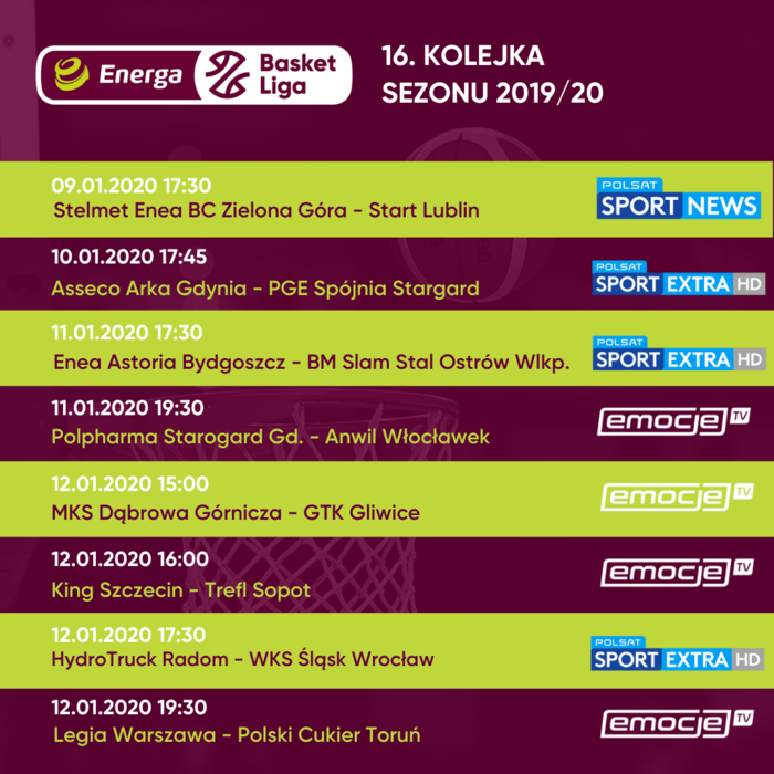 Sportowe stacje Polsatu od czwartku do niedzieli pokażą cztery ciekawe mecze Energa Basket Ligi: Stelmet Enea BC - Start, Asseco Arka - PGE Spójnia, Enea Astoria - BM Slam Stal oraz HydroTruck - WKS Śląsk! Na pozostałe spotkania zapraszamy do serwisu Emocje.TV.