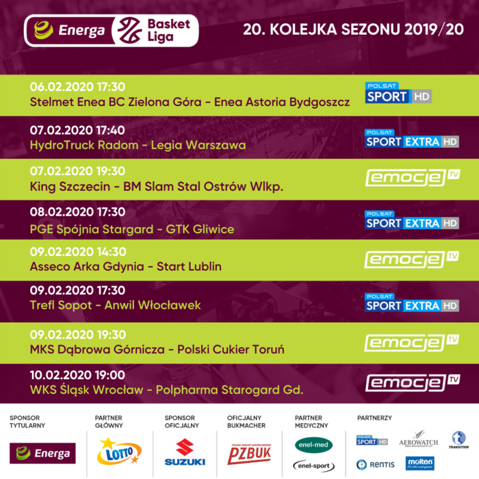 Przed nami już 20. kolejka Energa Basket Ligi! Od czwartku do niedzieli sportowe stacje Polsatu pokażą cztery spotkania: Stelmet Enea - Enea Astoria, HydroTruck - Legia, PGE Spójnia - GTK i Trefl - Anwil. Na pozostałe mecze zapraszamy do serwisu Emocje.TV