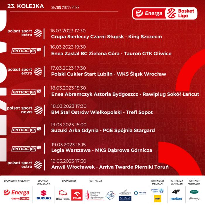 Od czwartku do niedzieli czekają nas ponownie ogromne emocje z Energa Basket Ligą! W sportowych stacjach Polsatu zobaczymy mecze Grupa Sierleccy Czarni - King, Polski Cukier Star - WKS Śląsk, BM Stal - Trefl oraz Anwil - Arriva Twarde Pierniki. Pozostałe spotkania dostępne będą w serwisie Emocje.TV |