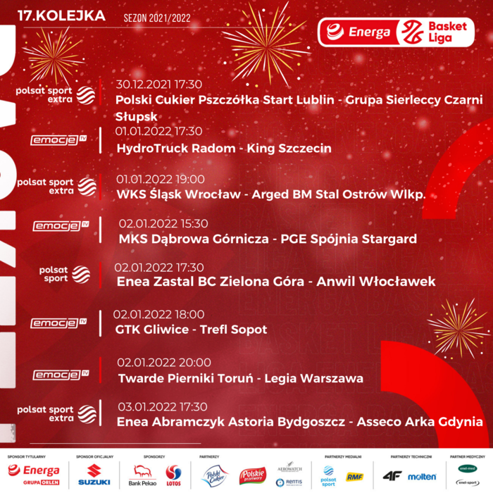 Przywitaj 2022 rok z Energa Basket Ligą! Ostatnim meczem jeszcze w 2021 roku będzie starcie Polski Cukier Pszczółka Start - Grupa Sierleccy Czarni, a już w Nowy Rok zobaczymy m. in. hitowe spotkanie WKS Śląsk - Arged BM Stal. Cztery mecze 17. kolejki będą transmitowane w sportowych stacjach Polsatu, pozostałe w Emocje.TV