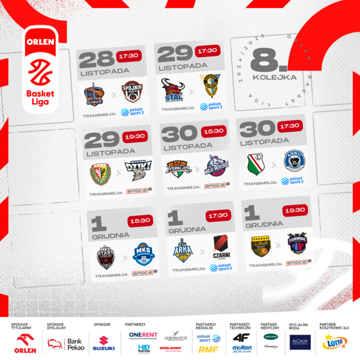 Pora na powrót ORLEN Basket Ligi po przerwie na mecze reprezentacji narodowych! W sportowych stacjach Polsatu zobaczymy spotkania Tauron GTK - PGE Spójnia, Tasomix Rosiek Stal - Górnik Zamek Książ, Legia - Anwil oraz AMW Arka - Energa Icon Sea Czarni. Pozostałe starcia będą dostępne w serwisie Emocje.TV