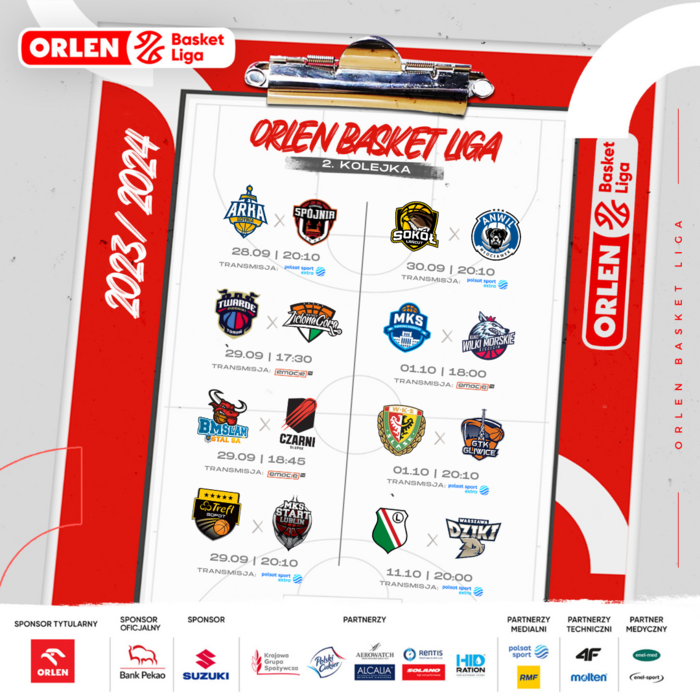 W czwartek rusza druga kolejka ORLEN Basket Ligi! Od czwartku do niedzieli wyjątkowo od godz. 20:00 w Polsat Sport Extra zobaczymy cztery mecze: Suzuki Arka - PGE Spójnia, Trefl - Polski Cukier Start, Sewertronics Sokół - Anwil oraz WKS Śląsk - Tauron GTK. Pozostałe spotkania w serwisie Emocje.TV