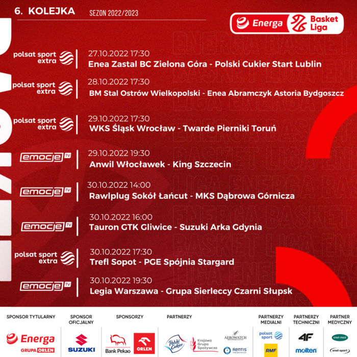 W czwartek spotkaniem Enea Zastal - Polski Cukier Start rozpoczyna się szósta kolejka Energa Basket Ligi! Jak zwykle na kibiców czeka mnóstwo ciekawych spotkań. Transmisje w sportowych stacjach Polsatu oraz w serwisie Emocje.TV