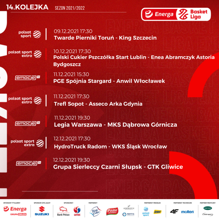 Twarde Pierniki kontra King, derby Trójmiasta i HydroTruck - WKS Śląsk - emocji w 14. kolejce Energa Basket Ligi nie zabraknie! Cztery mecze zobaczymy w sportowych stacjach Polsatu, a kolejne trzy będzie można śledzić w serwisie Emocje.TV.