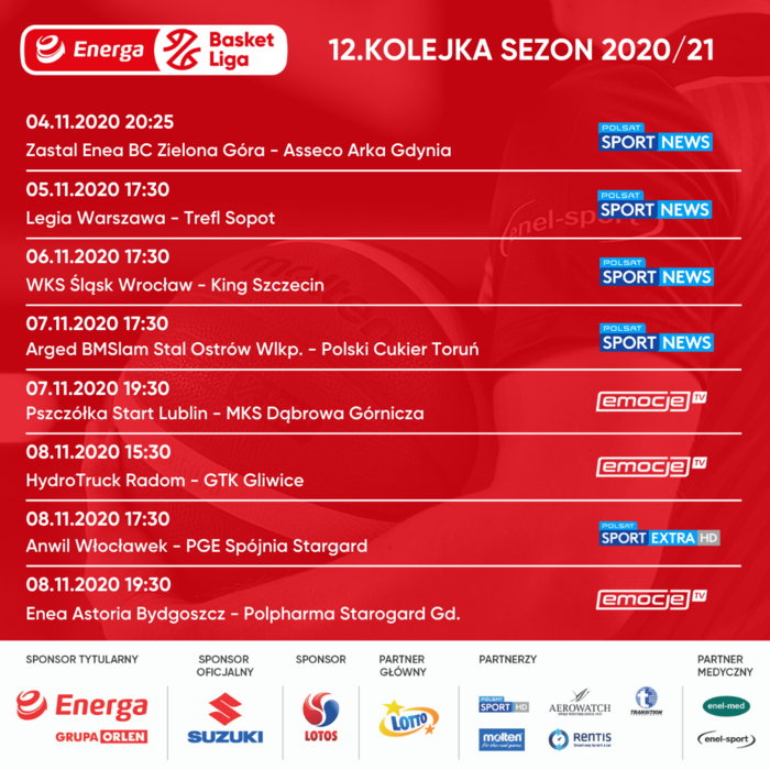12. kolejka Energa Basket Ligi rusza już w środę! Tym razem aż pięć spotkań będzie można zobaczyć w sportowych stacjach Polsatu. Na pozostałe mecze zapraszamy do serwisu Emocje.TV