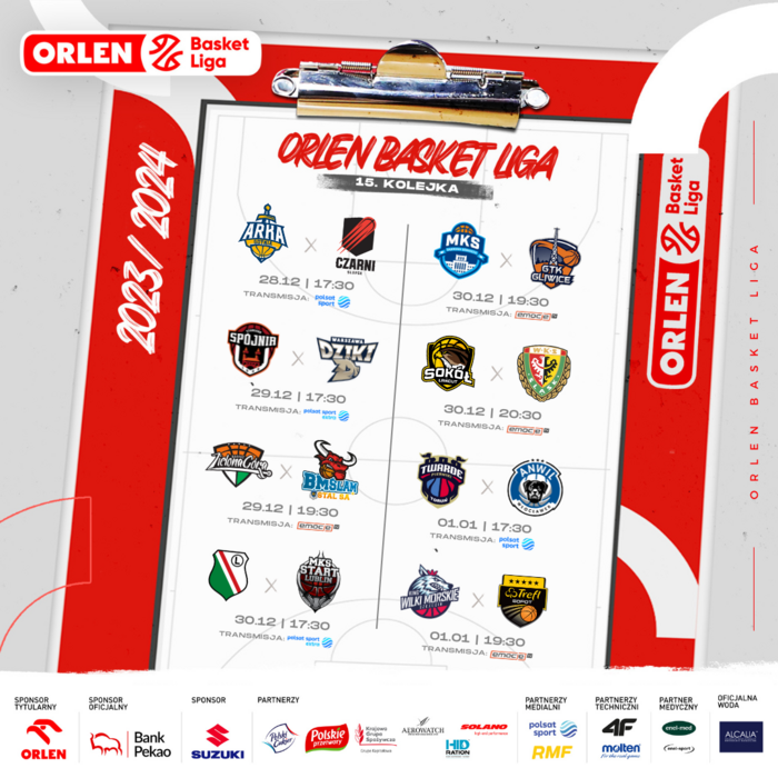Przed nami ostatnia kolejka pierwszej rundy ORLEN Basket Ligi, która ostatecznie wyłoni drużyny, które awansują do turnieju finałowego Pekao S.A. Pucharu Polski! W Nowy Rok Polsat Sport pokaże hitowe derby Arriva Polski Cukier - Anwil. Ponadto w sportowych stacjach Polsatu zobaczymy mecze: Krajowa Grupa Spożywcza Arka - Grupa Sierleccy Czarni, PGE Spójnia - Dziki oraz Legia - Polski Cukier Start.