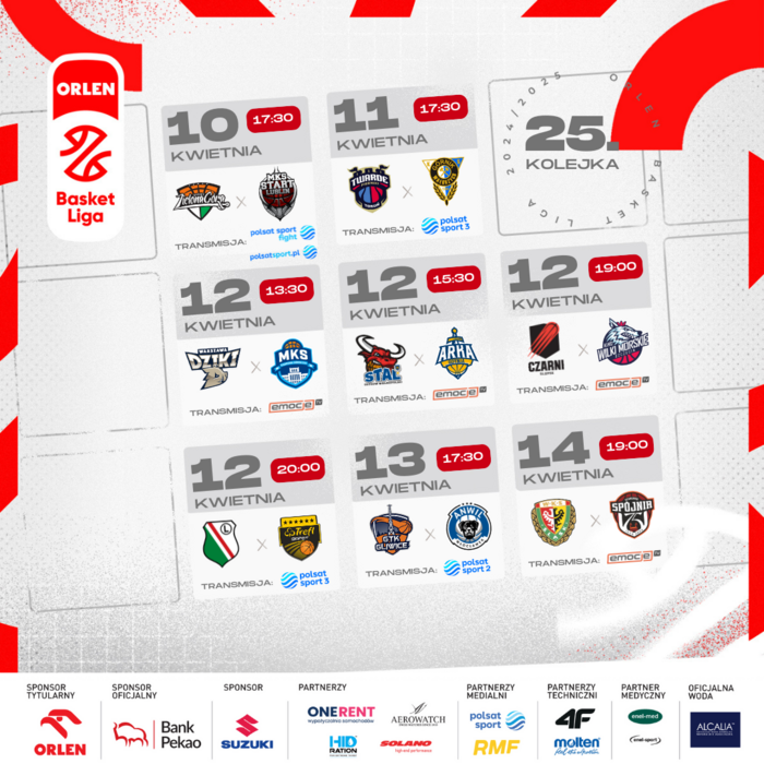 25. kolejka ORLEN Basket Ligi rozegrana zostanie od czwartku do poniedziałku! W sportowych stacjach Polsatu zobaczymy spotkania: Orlen Zastal - PGE Start, Arriva Polski Cukier - Górnik Zamek Książ, Legia Trefl oraz Tauron GTK - Anwil. Pozostałe mecze będą dostępne w serwisie Emocje.TV