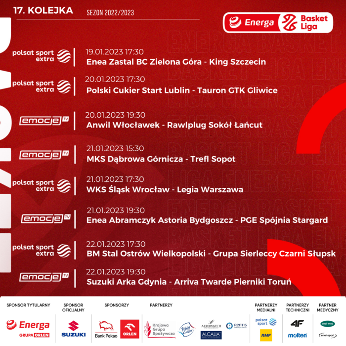Sporo emocji czeka nas w 17. kolejce Energa Basket Ligi! W sobotę w Polsat Sport Extra zobaczymy rewanż za ubiegłoroczny finał, czyli mecz WKS Śląska Wrocław z Legią Warszawa. Ciekawie będzie także w Zielonej Górze, gdzie Enea Zastal podejmie Kinga oraz w Ostrowie Wielkopolskim - BM Stal zagra z Grupa Sierleccy Czarnymi.