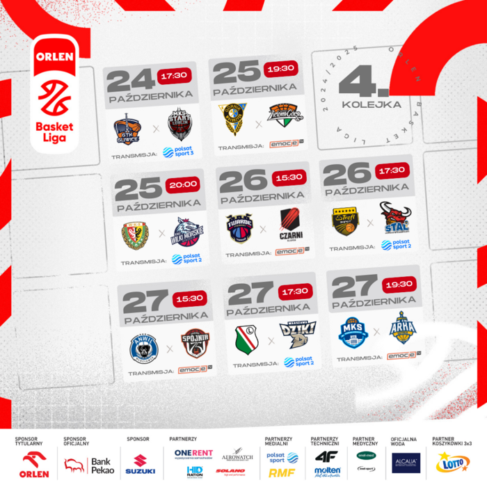 W czwartek rusza czwarta kolejka ORLEN Basket Ligi! W sportowych stacjach Polsatu zobaczymy spotkania Tauron GTK - Polski Cukier Start, WKS Śląsk - King, Trefl - Tasomix Rosiek Stal oraz Legia - Dziki. Pozostałe mecze dostępne będą w serwisie Emocje.TV