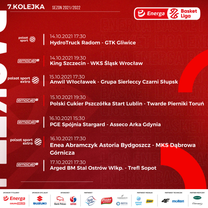 Przed nami siódma kolejka Energa Basket Ligi! W sportowych stacjach Polsatu będzie można zobaczyć mecze HydroTruck - GTK, Anwil - Grupa Sierleccy Czarni, Enea Abramczyk Astoria - MKS oraz Arged BM Stal - Trefl. Pozostałe spotkania będą transmitowane w serwisie Emocje.TV