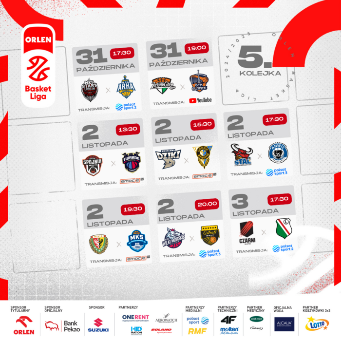 Przed nami bardzo ciekawa piąta kolejka ORLEN Basket Ligi. Powrót Waltera Hodge’a, czyli mecz Zastal - Tauron GTK dostępny będzie w otwartej transmisji na YouTube! W sportowych stacjach Polsatu zobaczymy spotkania Polski Cukier Start - AMW Arka, Tasomix Rosiek Stal - Anwil, King - Trefl oraz Energa Icon Sea Czarni - Legia. Pozostałe mecze będą dostępne w serwisie Emocje.TV