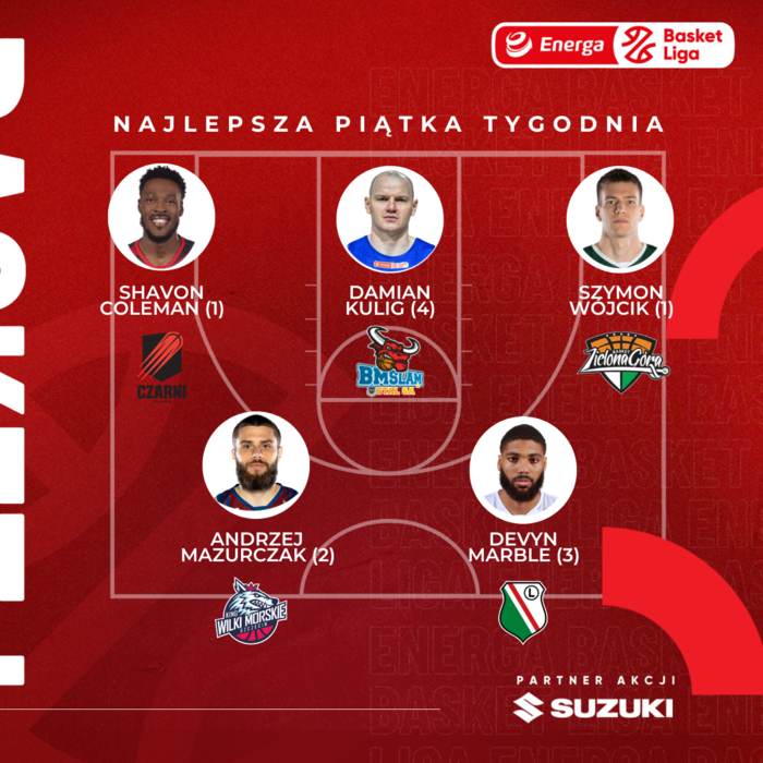 Andrzej Mazurczak, Devyn Marble, Shavon Coleman, Szymon Wójcik, Damian Kulig- to najlepsza piątka 10. tygodnia Energa Basket Ligi. Partnerem akcji jest Suzuki Motor Poland.