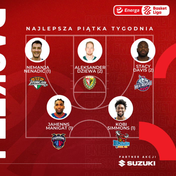 Jahenns Manigat, Kobi Simmons, Nemanja Nenadić, Stacy Davis, Aleksander Dziewa - to najlepsza piątka 13. tygodnia Energa Basket Ligi. Partnerem akcji jest Suzuki Motor Poland.