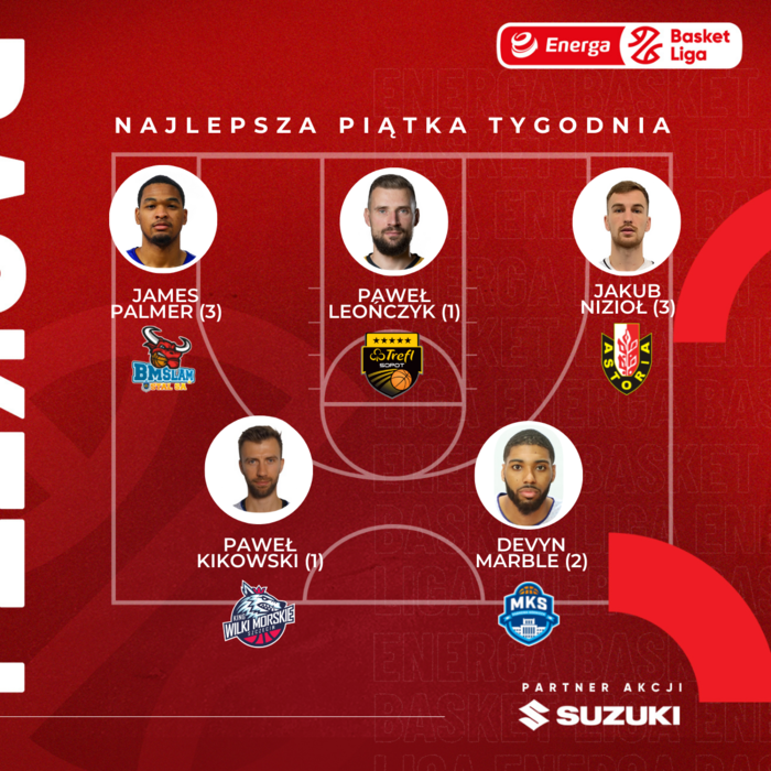 Devyn Marble, Paweł Kikowski, James Palmer, Jakub Nizioł, Paweł Leończyk - to najlepsza piątka 15. tygodnia Energa Basket Ligi. Partnerem akcji jest Suzuki Motor Poland.