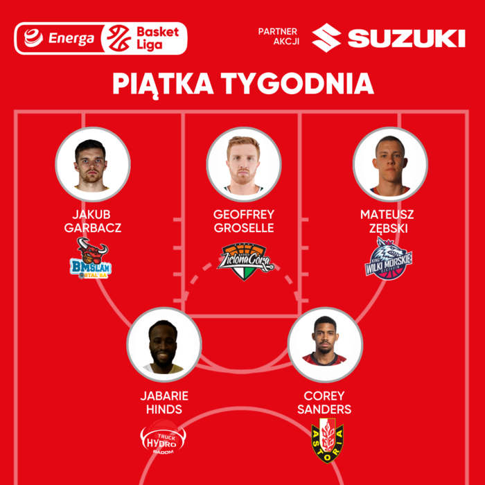 Jabarie Hinds, Corey Sanders, Jakub Garbacz, Mateusz Zębski i Geoffrey Groselle - to najlepsza piątka 15. tygodnia Energa Basket Ligi. Partnerem akcji jest Suzuki Motor Poland.