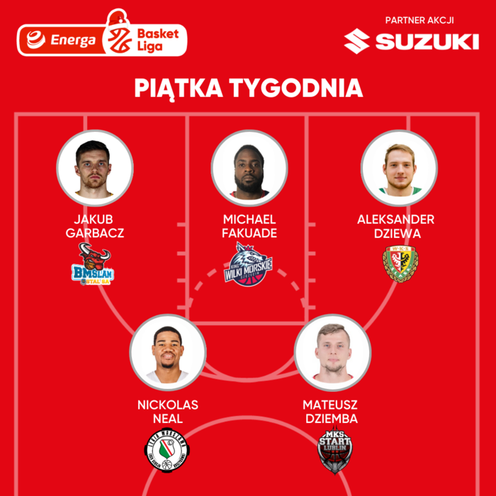 Nickolas Neal, Mateusz Dziemba, Jakub Garbacz, Aleksander Dziewa i Michael Fakuade- to najlepsza piątka 17. tygodnia Energa Basket Ligi. Partnerem akcji jest Suzuki Motor Poland.