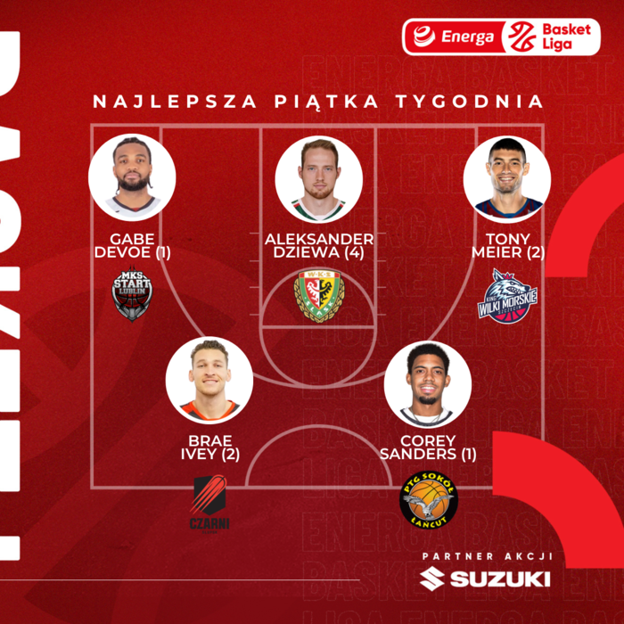 Corey Sanders, Brae Ivey, Gabe DeVoe, Tony Meier, Aleksander Dziewa- to najlepsza piątka 17. tygodnia Energa Basket Ligi. Partnerem akcji jest Suzuki Motor Poland.