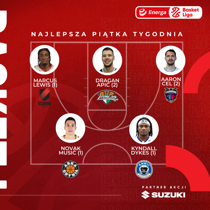 Novak Musić, Kyndall Dykes, Marcus Lewis, Aaron Cel, Dragan Apić - to najlepsza piątka 19. i 20. tygodnia Energa Basket Ligi. Partnerem akcji jest Suzuki Motor Poland.