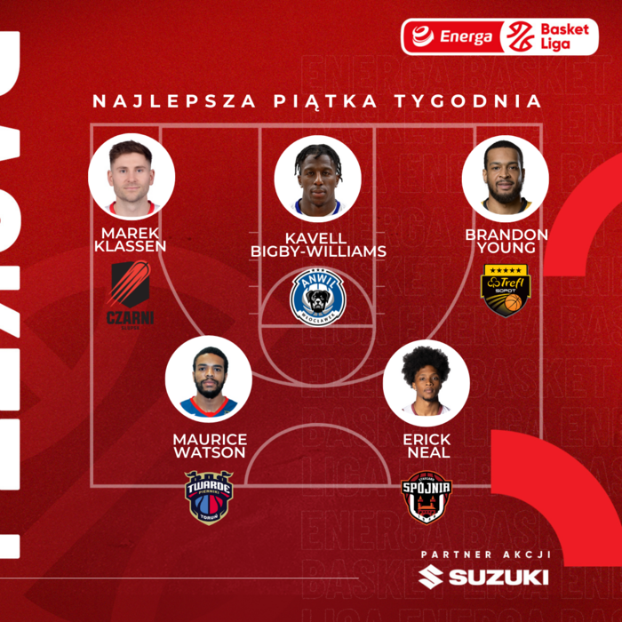 Maurice Watson, Erick Neal, Marek Klassen, Brandon Young, Kavell Bigby-Williams - to najlepsza piątka 4. tygodnia Energa Basket Ligi. Partnerem akcji jest Suzuki Motor Poland.