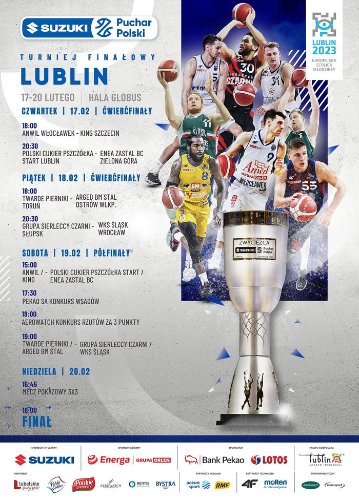 W czwartek w Lublinie rozpoczyna się rywalizacja o Suzuki Puchar Polski! Osiem drużyn Energa Basket Ligi przez cztery dni powalczy o prestiżowe trofeum. Ponadto zobaczymy Pekao S.A. Konkurs Wsadów, Aerowatch Konkurs Rzutów za 3 Punkty oraz prezentację i mecz LOTTO 3x3 Team. Transmisje w sportowych stacjach Polsatu. Bilety na EVENTIM.PL
