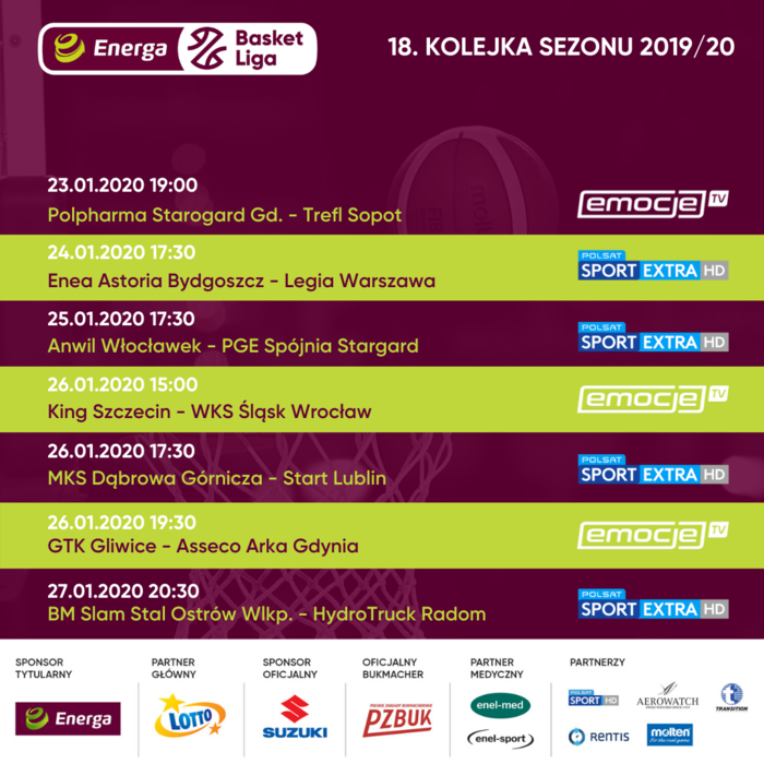 W czwartek rusza 18. kolejka Energa Basket Ligi! W sportowych stacjach Polsatu tym razem zobaczymy spotkania: Enea Astoria - Legia, Anwil - PGE Spójnia, MKS - Start i BM Slam Stal - HydroTruck. Na pozostałe mecze zapraszamy do serwisu Emocje.TV