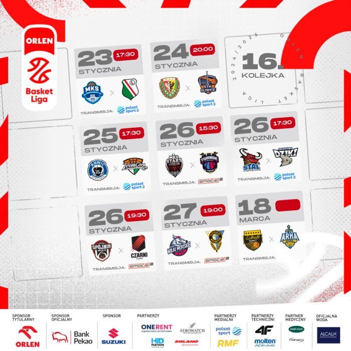 W ORLEN Basket Lidze przyszła pora na rundę rewanżową! W sportowych stacjach Polsatu będzie można zobaczyć spotkania MKS - Legia, WKS Śląsk - Tauron GTK, Anwil - Orlen Zastal oraz Tasomix Rosiek Stal - Dziki. Pozostałe mecze będą dostępne w serwisie Emocje.TV