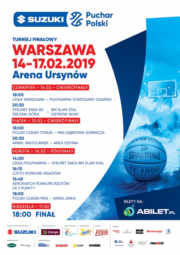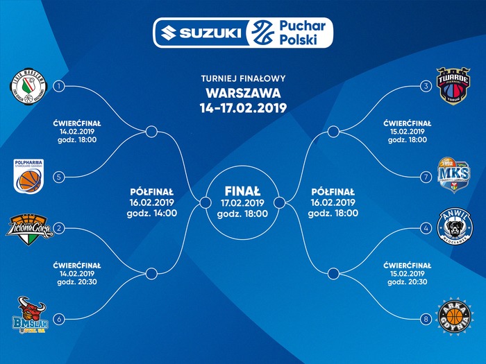 Turniej Finałowy Suzuki Pucharu Polski koszykarzy ponownie zostanie rozegrany w Arenie Ursynów w Warszawie. Osiem czołowych zespołów Energa Basket Ligi od czwartku, 14 lutego do niedzieli, 17 lutego będzie rywalizować o prestiżowe trofeum. Znamy już pary ćwierćfinałowe. Bilety dostępne na abilet.pl