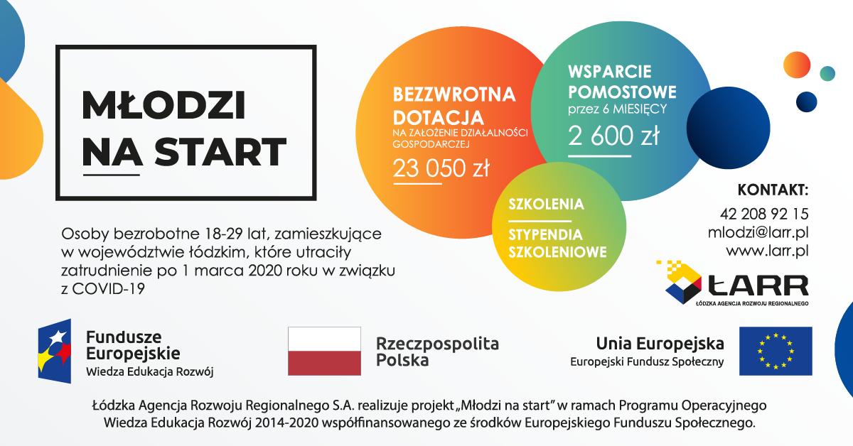 Od 24 kwietnia 2021 r. trwa rekrutacja do projektu "Młodzi na start". Celem projektu jest zwiększenie aktywności zawodowej 120 osób w wieku od 18 do 29 roku życia zamieszkujących województwo łódzkie, które utraciły zatrudnienie po 1 marca 2020 roku w związku z pandemią COVID-19, zamierzających prowadzić działalność gospodarczą przez co najmniej 12 miesięcy. Możliwe dofinansowanie wynosi nawet 38.650 zł.