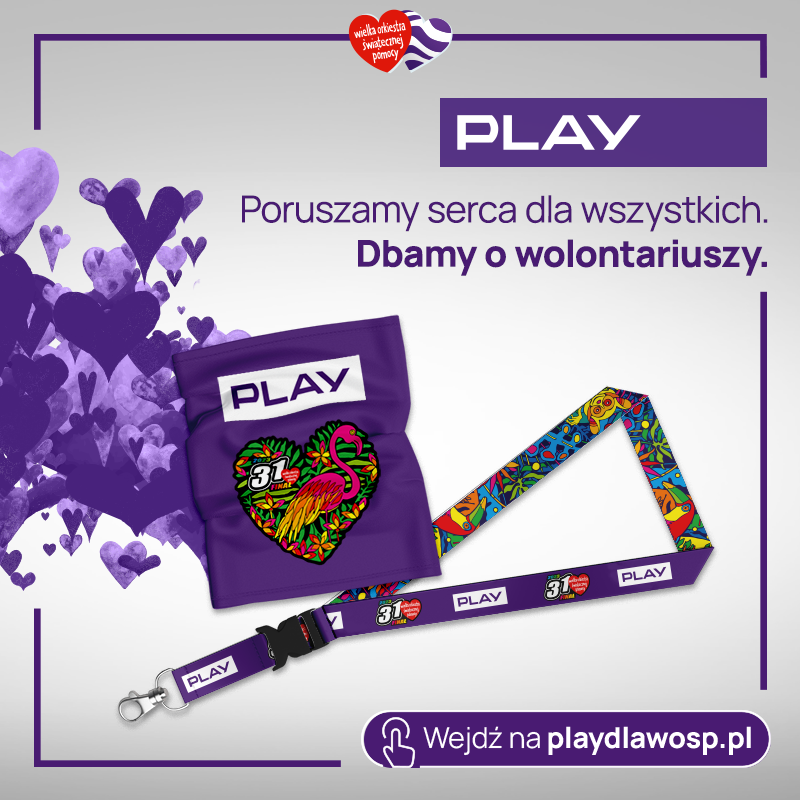 Siema! W tym roku Play porusza serca dla wszystkich i chcemy zadbać również o Was, woluntariuszy WOŚP. Dlatego mamy dla Was prezenty: specjalnie zaprojektowane smycze i kominy.