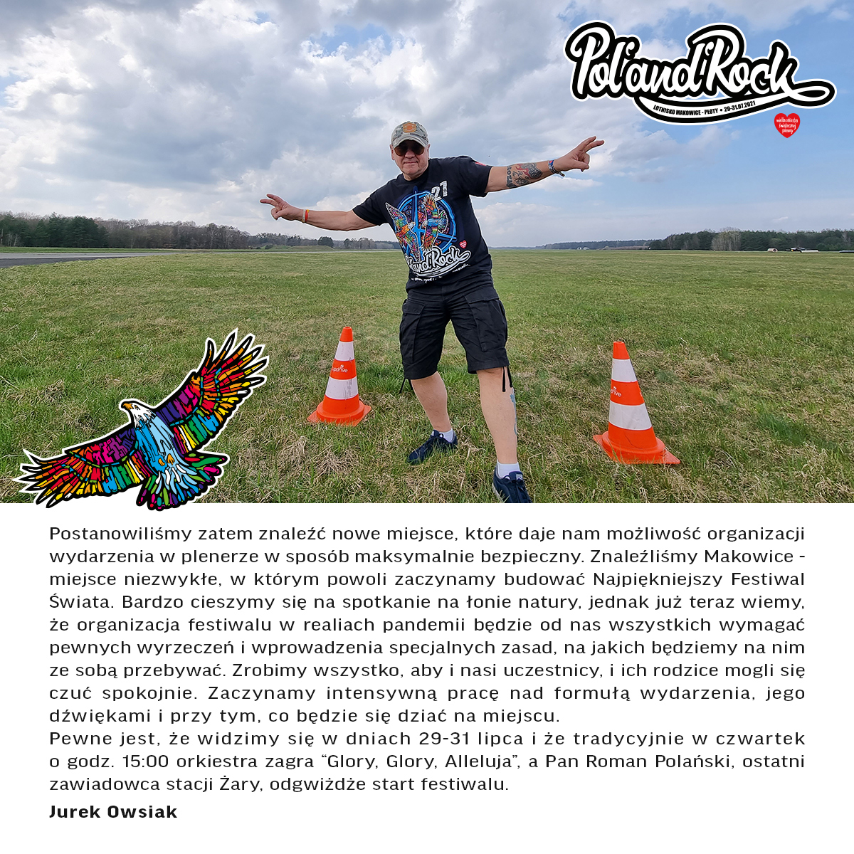 Friend!Dokładnie 24 godziny temu Jurek w trakcie swojej audycji w Antyradiu ogłosił bardzo ważną zmianę dotyczącą najbliższego Pol'and'Rock Festivalu. Z prawdziwą radością podaliśmy ją dalej w naszych mediach społecznościowych.27. Pol'and'Rock Festival odbędzie się w dniach 29 - 31 lipca w nowej lokalizacji. Życie i sytuacja, z którą mamy do czynienia stawia przed nami konieczność zmiany podejścia do organizacji naszego wydarzenia. Pol'and'Rock Festival przeniesie się w tym roku do nowej lokalizacji - Lotniska Makowice - Płoty (województwo zachodniopomorskie). Festiwal przyjmie formę hybrydową - dostępny będzie zarówno dla ograniczonej grupy publiki obecnej na miejscu, jak i dla widzów śledzących jego przebieg w internecie. |