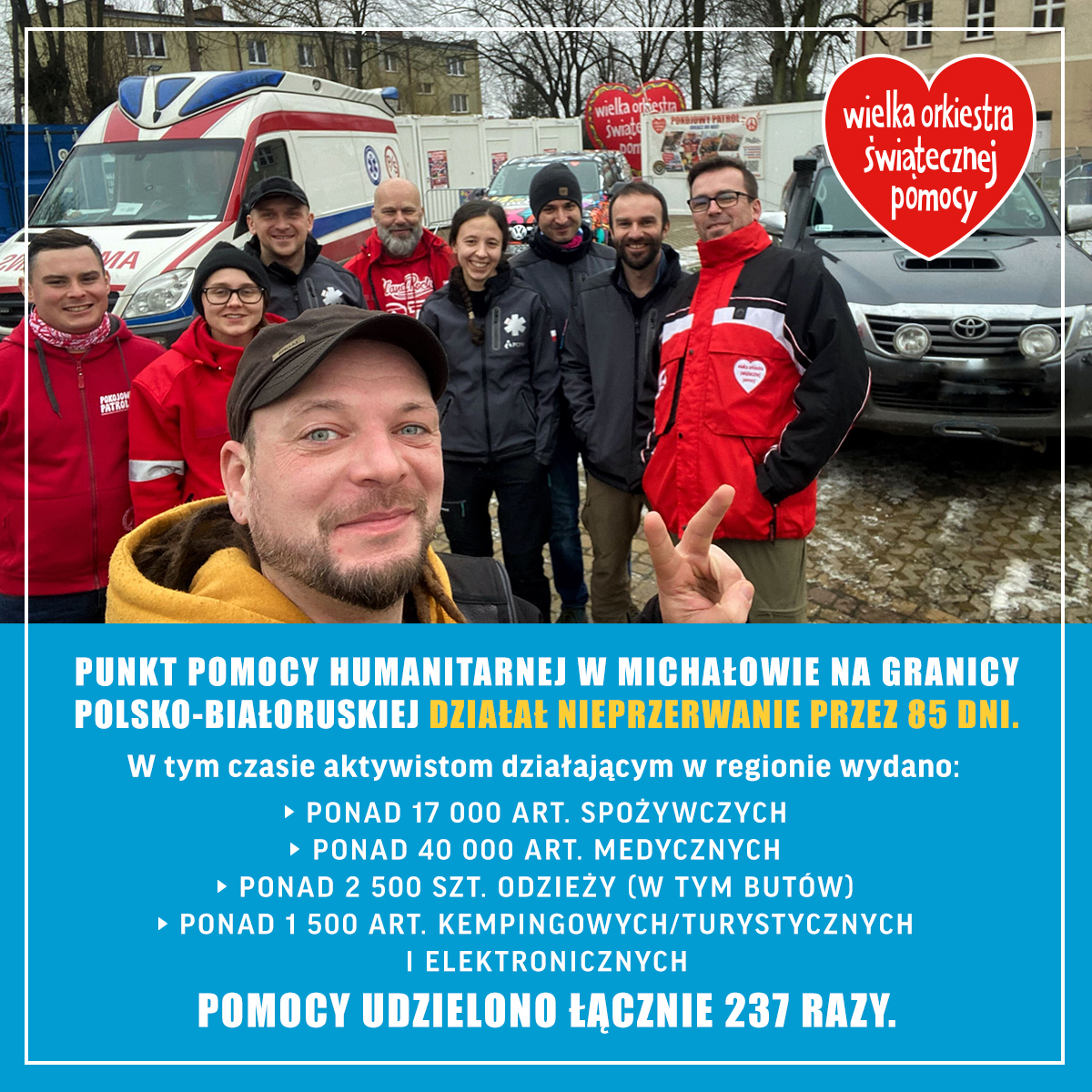 Utworzony w Michałowie Punkt Pomocy Humanitarnej WOŚP - po 85 dniach -zakończył działania. W tym czasie wsparcia udzielono dziesiątkom aktywistów pracujących w obszarze przygranicznym.