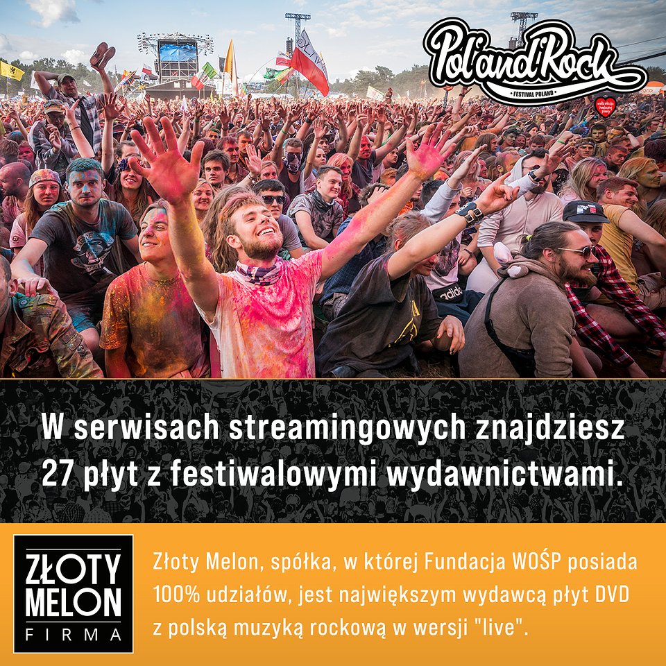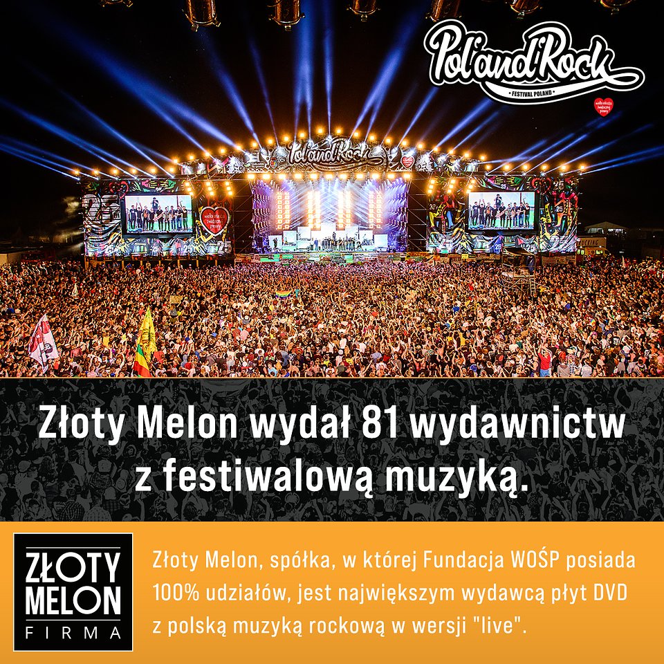 Informacje o Festiwalu: Złoty Melon to spółka, w której Fundacja WOŚP posiada 100% udziałów. Spółka ma za zadanie wspierać Fundację w zakresie jej działalności, pomagać w optymalizacji kosztów i pozyskiwaniu dodatkowych źródeł przychodów, które są przekazywane do Fundacji w postaci dywidendy. Do tej pory Złoty Melon przekazał już Fundacji Wielka Orkiestra Świątecznej Pomocy dywidendy w wysokości 6 581 846,94 PLN i nadal sprawnie prowadzi działalność, dzięki której spółka dynamicznie się rozwija. Złoty Melonjest producentem wykonawczym Festiwali Pol'and'Rock i styczniowych finałów, a także największym wydawcą płyt DVD z polską muzyką rockową w wersji "live".